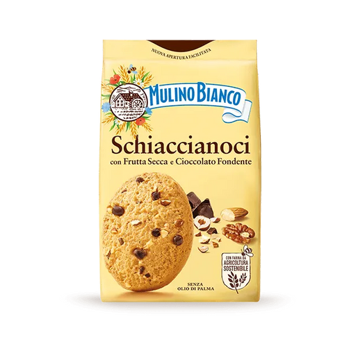 Mulino Bianco BarillaEnjoy a satisfying crunch with Mulino Bianco Schiaccianoci—Italian cookies made with a delicious blend of hazelnuts and chocolate chips. These shor...