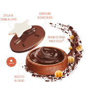 There is nothing more magical than when two dreams meet 100% Italian cocoa and hazelnut biscuit with a magical heart of Crema Pan di Stelle enclosed by a chocolate coating and a milk cream star.