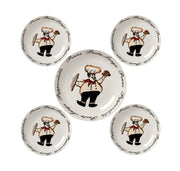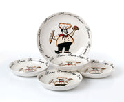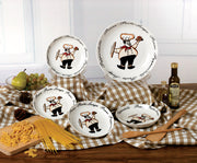 The porcelain Pasta set includes 1 large serving bowl and 4 small individual bowls. Serve pasta or any family favorite in this sleek and fun Chef design set. A whimsical chef balancing a dish of food in one hand, a loaf of bread in the other hand, and an array of pasta choices circling the bowls. Pasta dinners are enjoyable and now educational as you brush up on your pasta knowledge. Bowls are dishwasher and microwave safe for easy use and easy cleanup!