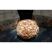 The genius recipe, based on artisan techniques tied to the oldest pastry traditions, says that after 72 hours of natural leaven, panettone is stuffed with the best apricots "pellicchielle", matured to the warm sun of Vesuvius and then candied with a completely crafted process. A dough made from the union of wheat flour, fresh from fresh-cut eggs of the highest category, Bufala butter, and cream, sugar, almonds, apricots "Pellechiella" and honey. The whole thing is made to grow naturally and keep it alive with regular daily refreshments. The decoration with crunchy and fragrant almonds embellishes the exterior of this wonderful product of sweets craftsmanship.
