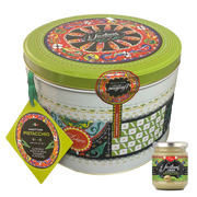 In the beautiful metal tin you get a Pistachio Panettone with a Pistachio cream to spread on a slice of panettone.